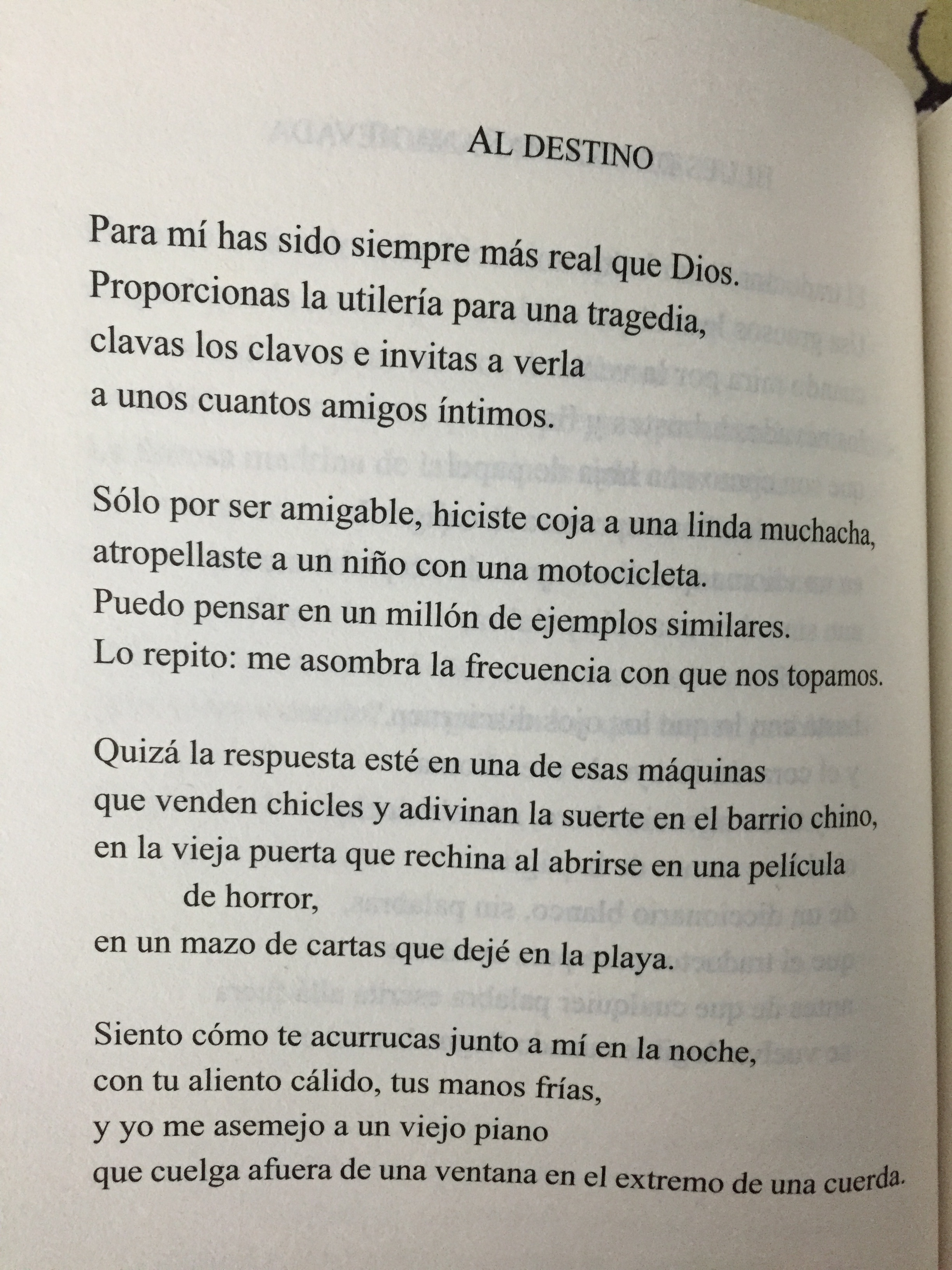 No puedo dormir porque es inevitable pensar, durante esas horas agónicamente largas, entre las 3 y las 5 de la mañana, que el destino se ha presentado en mi vida muchas veces. Que a veces creo demasiado en el cuento de la vida como la suma de las decisiones, y dejo de lado los eventos mágicos que me han alejado de unos caminos y acercado a otros, de maneras oscuras, imperceptibles e incomprensibles. Sí, el destino es una suerte de religión o de dios, que se presenta y mueve todo de lugar,  tomando la forma de muertes, accidentes, enfermedades, cambios de residencia y encuentros esenciales que cambian la vida amistosa, la amorosa, las prioridades y la idea de futuro.  El destino es una fuerza que nos aterra aceptar, porque tendríamos que reconocer que a veces somos como «un viejo piano que cuelga afuera de una ventana en el extremo de una cuerda».